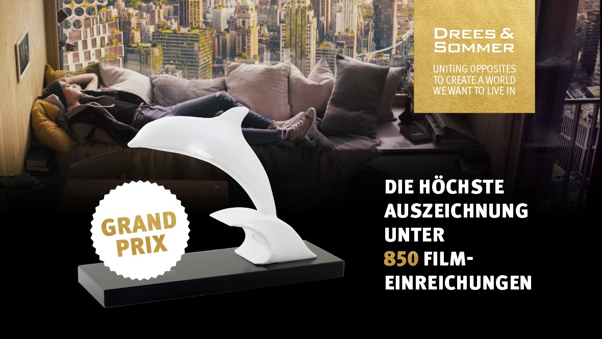 Für seine einzigartige Storyline und Umsetzung erhielt der Drees & Sommer-Imagefilm „THE BLUE WAY, Next Exit” ganze sechs Auszeichnungen bei den Cannes Corporate Media & TV Awards 2020. Darunter der weiße Delphin, die höchste aller Auszeichnung, die nur ein einziges Mal unter allen goldenen Preisträgern der insgesamt 850 eingereichten Beiträge vergeben wird. Mit dem blauen Delphin erhielt Cinecore, mit der Drees & Sommer den Imagefilm verwirklicht hat, ebenfalls die höchste Auszeichnung als beste Produktionsfirma. Außerdem räumte THE BLUE WAY next exit auch noch zwei Awards in Gold in den Kategorien „Imagefilme“ und „Corporate Videos“ und zwei in Schwarz in den technischen Kategorien „Beste Kamera“ und „Bestes Sounddesign“ ab. Die Verleihung der Cannes Corporate Media & TV Awards fand am 24. November 2020 virtuell statt.