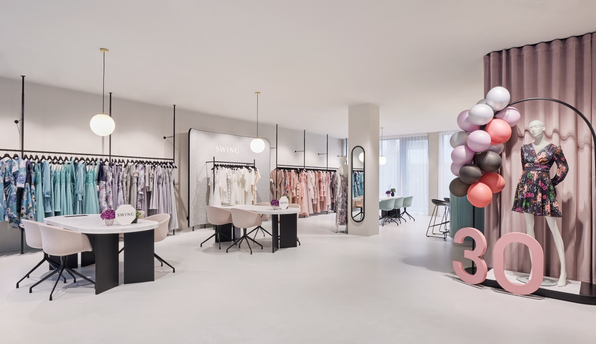 Das Occasionwear-Label SWING steht seit über 30 Jahren für feminine Tageskleider, elegante Cocktaildresses und festliche Abendroben. Nun hat SWING eine neue Präsenz auf der Kaiserswerther Straße im dichten und zentral gelegenen Showroom-Netz namhafter Fashionbrands in Düsseldorf bezogen. Die Gestaltung der 200 m² großen Ausstellungsfläche wurde vom Architektenbüro Schwitzke & Partner konzipiert. Die Umbaumaßnahmen betreute die Schwesterfirma, der Generalübernehmer Schwitzke Project.