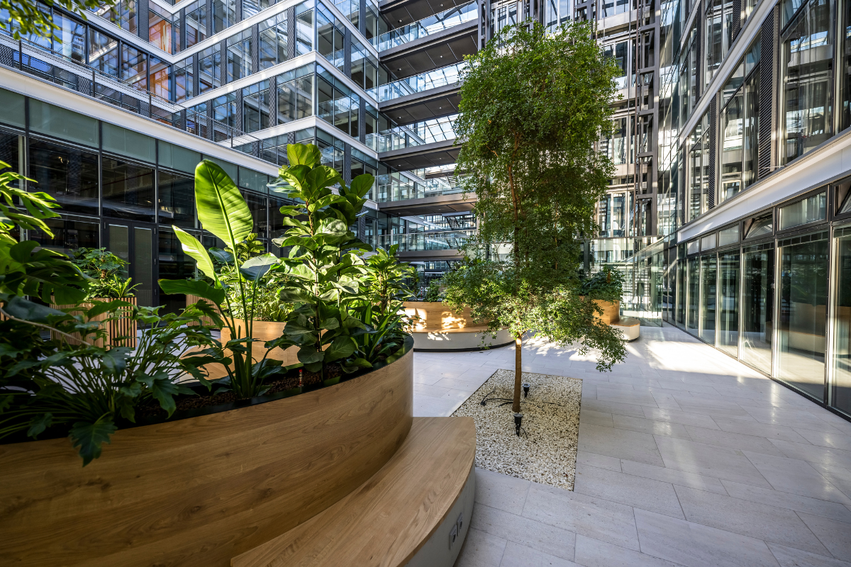 Im Zentrum des durchdachten Bürogebäudes steht das lichtdurchflutete, grüne Atrium, das einen einladenden Gemeinschaftsbereich bietet. Von den Innenbüros und Hubs aus haben die Nutzer einen direkten Blick auf das Herzstück des Gebäudes. Vier verschiedene Hubs auf unterschiedlichen Etagen fördern Kommunikation, Austausch und die Möglichkeit zur abteilungsübergreifenden Vernetzung.