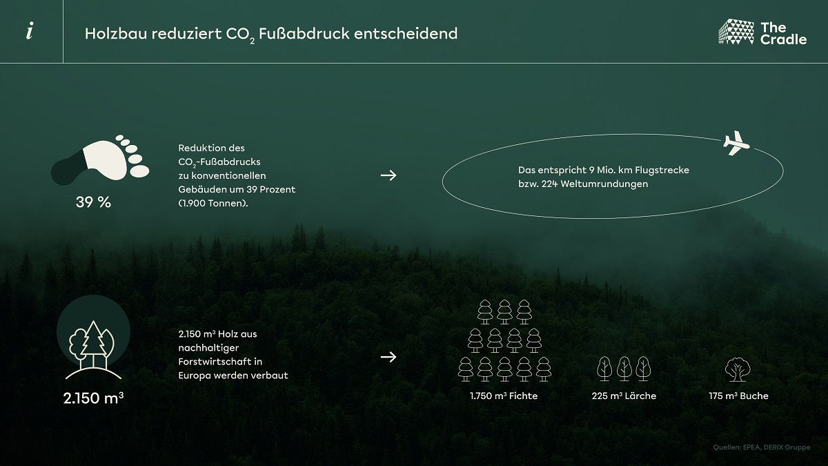 Das nachhaltige Bauprojekt The Cradle wird nach dem Cradle to Cradle (C2C) Prinzip als Holzhybridbau entwickelt. Das bedeutet, dass Holz mit anderen Baustoffen kombiniert und überall dort eingesetzt wird, wo es endliche Materialien wie Beton, Stahl oder Kunststoffe ersetzen kann. „Wir beziehen unser Holz gemäß der C2C Philosophie ausschließlich aus nachhaltiger Forstwirtschaft in Europa, größtenteils sogar aus Deutschland“, sagt Andreas Willms, Projektleiter The Cradle von INTERBODEN. „Berechnungen zufolge wird der CO2-Fußabdruck in der Konstruktion um rund 1.900 Tonnen im Vergleich zu konventionellen Gebäuden reduziert. Dies entspricht ca. 9 Mio. Kilometer Flugstrecke (224 Weltumrundungen) und einer Reduktion von rund 40 Prozent CO2 im Vergleich zu herkömmlichen Gebäuden. Der Einsatz von Holz, anstelle von endlichen Rohstoffen, ist hierfür der entscheidende Faktor.“ Ein weiterer Grund ist ein Logistikkonzept, bei dem das Holz direkt auf seinem Transportweg an geeigneten Stellen bearbeitet wird und keine großen Umwege machen muss.