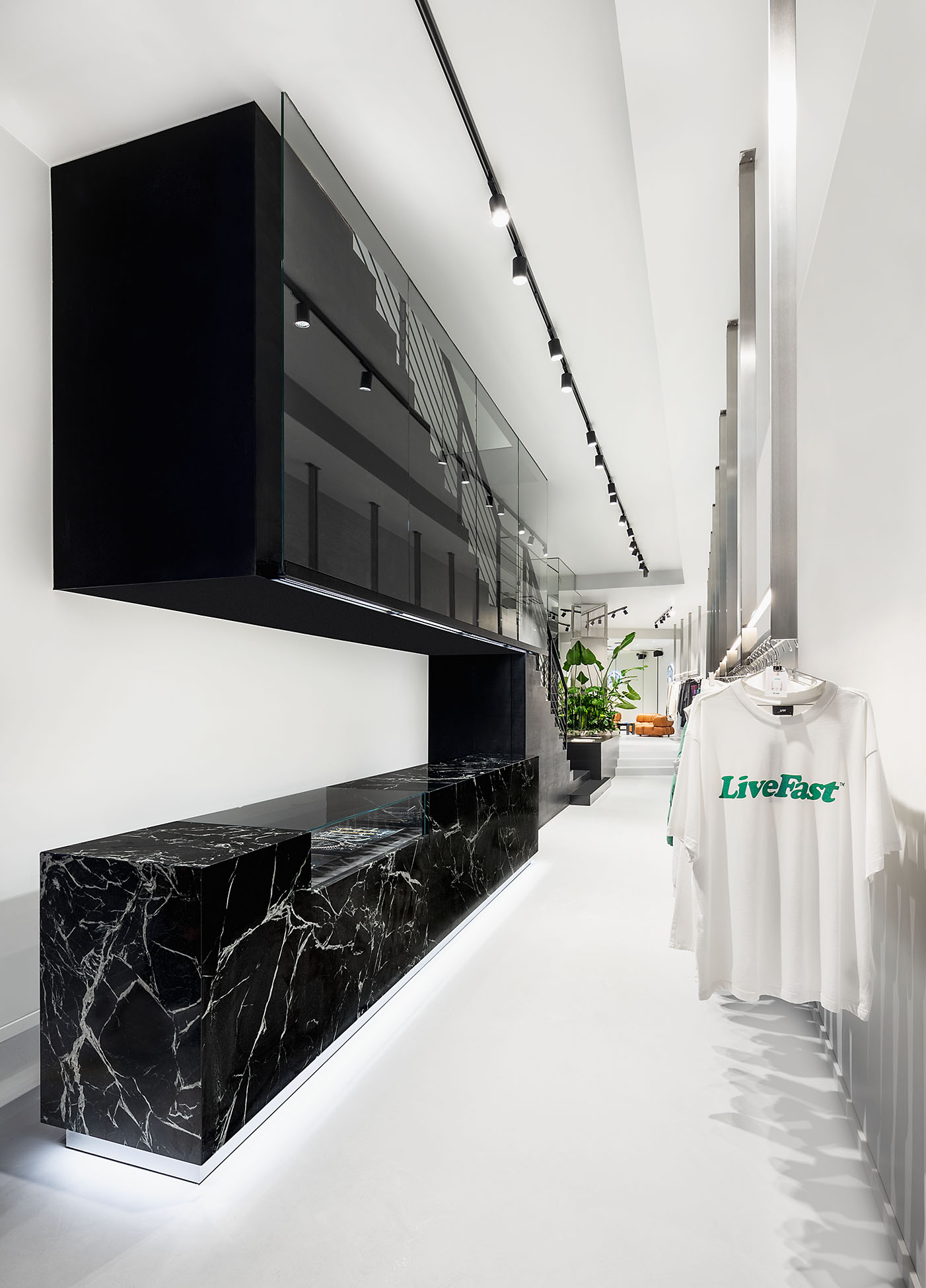 Der florierenden Streetstyle-Szene verleiht Schwitzke & Partner mit dem LFDY-Store auf der Einkaufsstraße Hohe Bleichen ein charaktervolles Profil. Die architektonische DNA des Retail-Spaces umfasst dabei eine zweigeschossige Ladenfläche auf insgesamt 265 m². Während im Erdgeschoss des modernen Gebäudes Verkaufsflächen, der Showroom und ein großzügiger Umkleidebereich liegen, erwartet die Kund:innen im galerieartigen Obergeschoss eine weitläufige Lounge für Private Shopping sowie das offen gestaltete Lager. Inspiriert von der cleanen Architektur der nordischen Metropole und den verglasten Bauten in Elbnähe, transferierte das Düsseldorfer Architektenteam zusammen mit dem Team von LFDY diese Elemente der Hansestadt in ihr Ladendesign. Der LFDY Gründer Lorenz Amend ist persönlich federführend für die Innovationen, die die Markenvision auf die Fläche bringt – und die Schwitzke&Partner umsetzt.